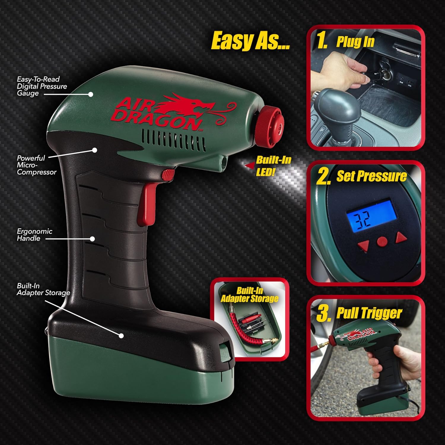 Includes Air Dragon with built in LED light for nighttime use, 14 foot car power cable, pressure Hose, ball adapter pin, and balloon adapter pin