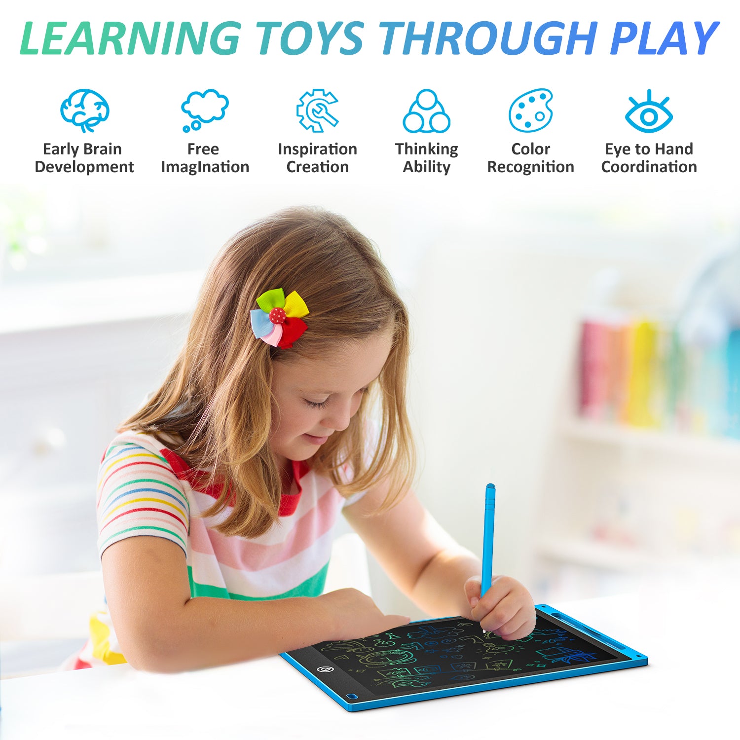 LCD writing board is a color LCD writing board, using advanced 10.5"-inch LCD color screen, non-radiation, safe to use. The LCD writing board with rich colors and high resolution allows children to use their imagination and enjoy! The pressure-sensitive liquid crystal writing surface lets your writing or drawing appear without delay. The tablet can be reused at least 10,0000 times. Don't worry it can't erase the image! Just click the button and the image disappears without a trace. Built-in button battery, the tablet lasts for 12 months, and ultra-low energy consumption. and can be easily replaced. Added smart lock function to lock the screen in case you accidentally press Un-clock to delete all drawings. Eco-friendly color LCD writing pad, no longer spend money on paper and pen. This sketchpad is like endless paper, you can draw, write, doodle, take notes, and even serve as a memo in the office anytime, anywhere. Portable and durable, it can easily slip into a briefcase, backpack or other bag. EYE PROTECTION, EASY TO VIEW: JUMPER writing tablet is made of reliable ABS materials, pressure sensitive LCD, radiation and glare-free to protect your eyes. 10.5" inches screen, apply the newest flexible liquid crystal technology, brighter and clearer than most LCD writing tablet. ENVIRONMENTALLY ECONOMIC: The electronic graphics tablet can write about 100,000 times with a clearance button. Only one coin battery is needed to replace the traditional battery. The coin battery is easy to buy and one doodle pad can only protect the environment but also help you save much money. ALWAYS ON AND READY TO USE: The doodle pad features pressure sensitivity that lets you draw thick and thin lines based on the pressure on your pen, just like using a pen and paper, perfect drawing tablet for kids, designers, and deaf-mute people. Naturally writing or drawing experience, without any delay. FOR ALL AGES: It is not only the kid's tablet for them to draw, arithmetic, spelling, and learning assistant, but also it is the best drawing pad for adults to make some notes, memo messages at office. Also, it is the best family message board for you to leave messages to your families, lovers. Most importantly, it's the best learning toy for kids quarantine at home. PORTABLE & EASY to USE: This writing board is ultra-thin and light (only 0.35lb), fits easily into a purse, scheduler, briefcase or backpack. Its battery can last for 12 months (battery included) and easy to replace when exhausted.