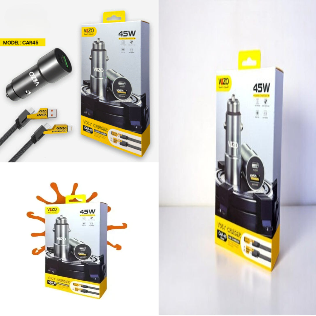 Car45 Volt Series – Dual Port Smart Car Charger (with V999 4-in-1 Cable) | Car Charger - Portable Charger For Car | Vizo Car Charger | Vizo Car45 Output Power: Type-C (PD): 25W USB-A (QC): 20W Max Combined Output: 45W USB-A port supports up to 65W for select devices Port Configuration: 1 x USB-A Port 1 x Type-C Port Input Voltage: DC 12V–24V (Universal Compatibility for All Cars) Key Features: Super Fast Charging (Supports PD & QC protocols) Dual Device Charging Simultaneously Overcharge, Overcurrent & Temperature Protection Heavy-Duty Build for Long-Term Use Signature Volt Series Design Elegant Retail Packaging Included Cable – V999 4-in-1 Smart Cable: USB to iPhone USB to Type-C Type-C to iPhone Type-C to Type-C 200 Copper Wires for efficient and stable charging Device Compatibility: Fully supports major smartphone brands, including: Apple (up to iPhone 16) Infinix (with Super Fast Charge) Xiaomi, Vivo, Oppo, Realme, and more Product Original Video [video width="478" height="850" mp4="https://hhcnewapp.blr1.digitaloceanspaces.com/uploads/2025/06/WhatsApp-Video-2025-06-26-at-5.22.22-PM-2.mp4"][/video]