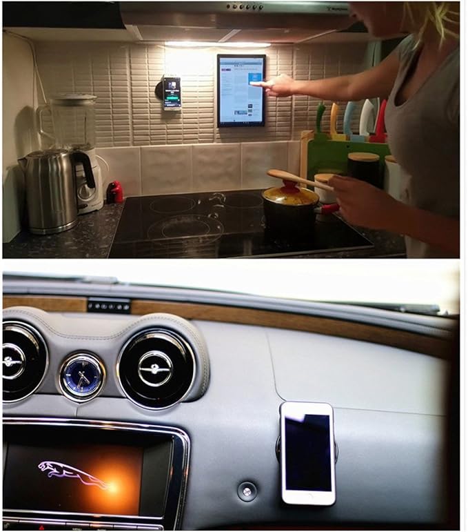 Made to be incredibly sticky. Will always remain still and in place when flat. Holds phones and other device with a strong grip. Remove, wash and reuse endlessly. One pad will be all you ever need. The stickiness will always remain the same! It can stick to your phone, pad, remote control, camera, speakers, water cup, key stick to glass, mirrors, whiteboards, metal, kitchen cabinets or tile, car, house and many more to fix anything anywhere. Ease of use :- easy paste, random removal, easy to carry, easy to use and can be used on the car, home, the company or more wall decoration. Anti-slip Gel Pads, which makes them great for sticking unusual or irregular shapes as well as hiding keys, organizing cables and sticking Go Pros to skateboards. More fun waiting for you to discover. 2 pcs in 1 pack Package Includes: 1x Round Phone Holder 1x Triangle Phone Holder     Product Pictures